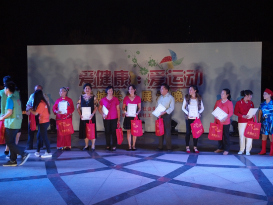 当晚我们社区参加队伍有三支,表演节目五个,形式多样,有腰鼓舞,扇子舞,柔力球舞,健康球舞,现代舞,而且我们社区两位长者担任晚会主持,她们充分体现了南城宏远长者健美的身姿与旺盛的活力,也展现了她们乐观积极生活的精神风貌。我们宏远长者表演队伍的舞蹈整齐大气,掀起晚会阵阵高潮,获得阵阵掌声,她们的家人和其他长者前来捧场都赞叹不绝。晚会最后她们还被选派为健身运动推广大使,肩负今后继续宣传推广健康运动的任务。